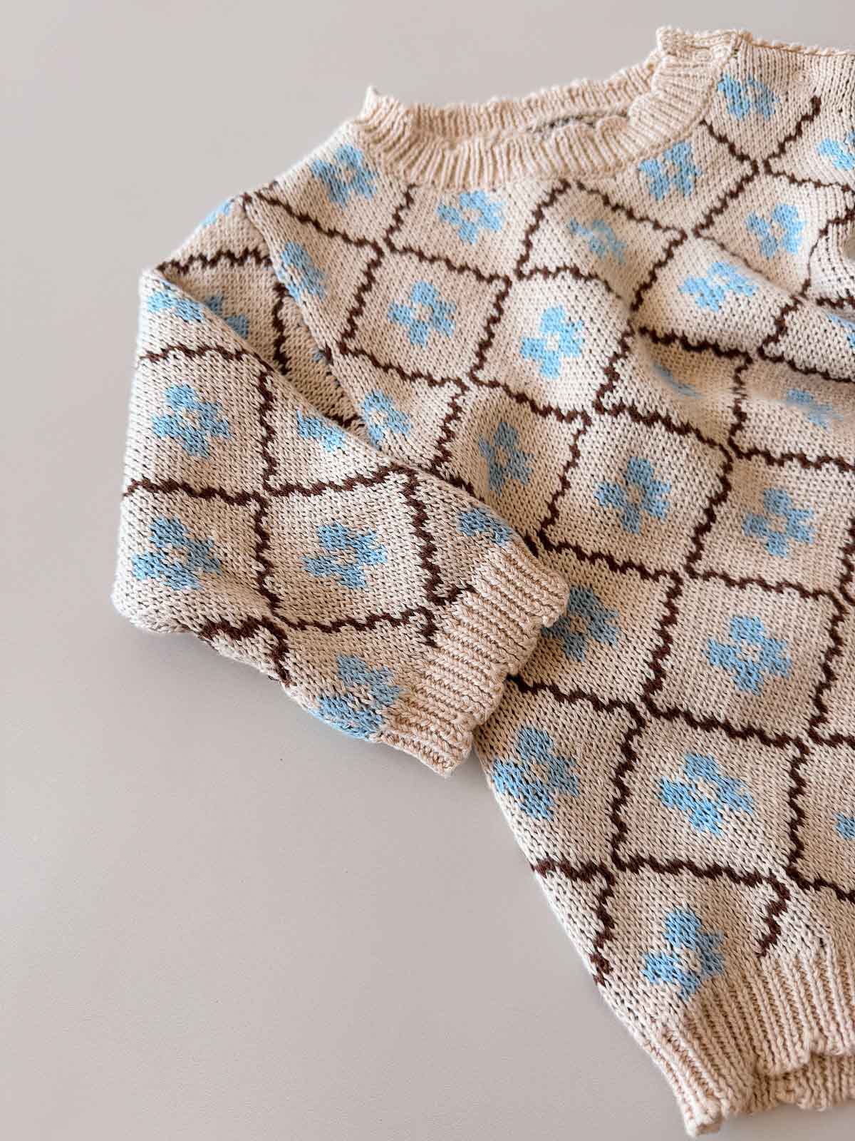 This cotton Jacquard knit romper features a delightful scollop edge with snaps at neck and crotch for easy wear. Our exclusive design features sweet bluebells, accented with a diamond wiggly trim border reminiscent of 70's wallpaper.