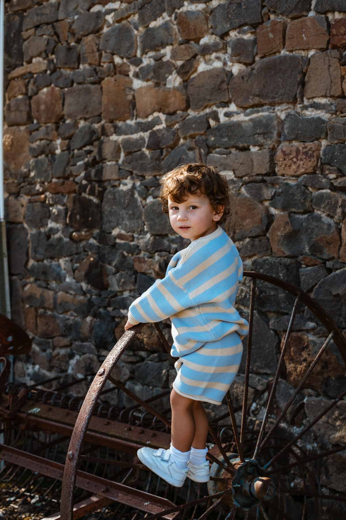 Experience the perfect blend of cuteness and comfort with our 100% Cotton Knit Jumper in Sky Stripe. This simple garter stitch knit makes for a medium weight jumper which provides warmth but still offers great breathability. It's soft, stretchy, and has a relaxed fit making it an easy everyday choice that pairs well with any outfit.